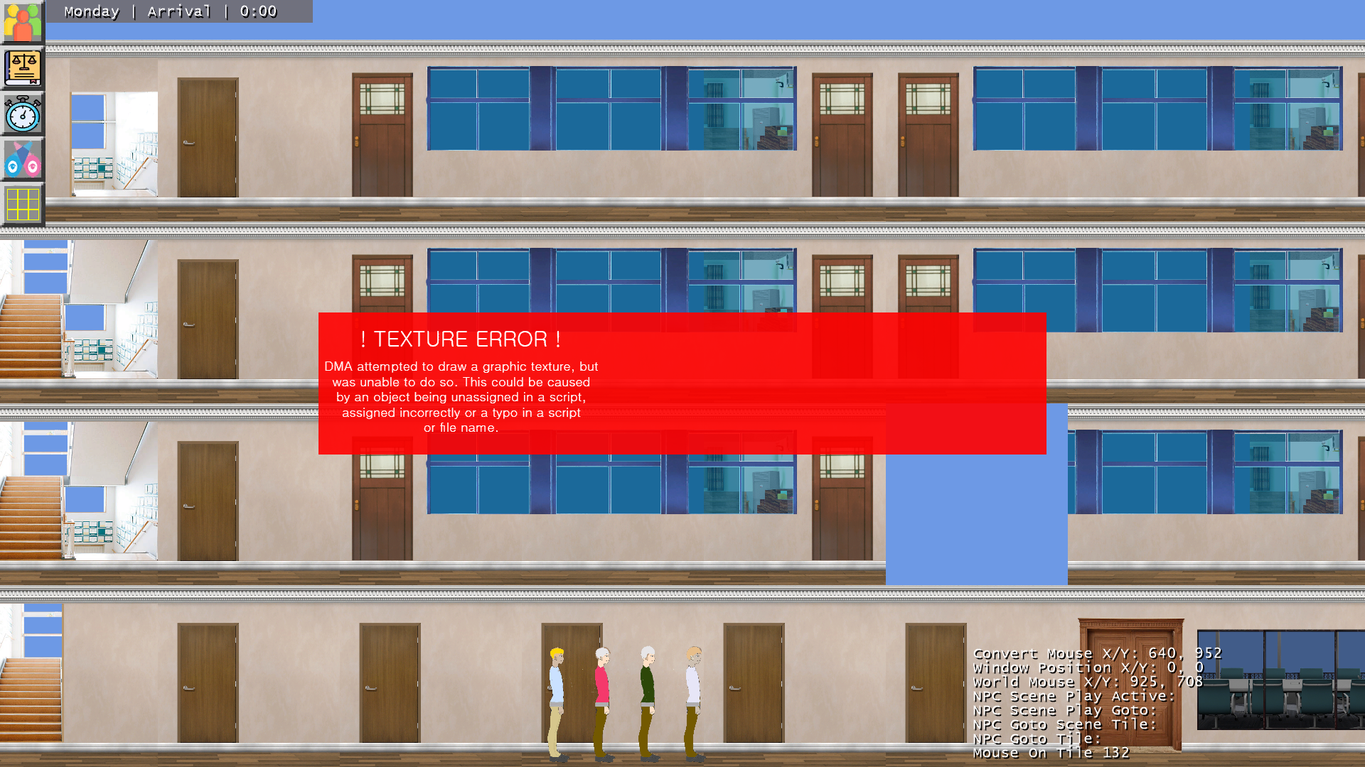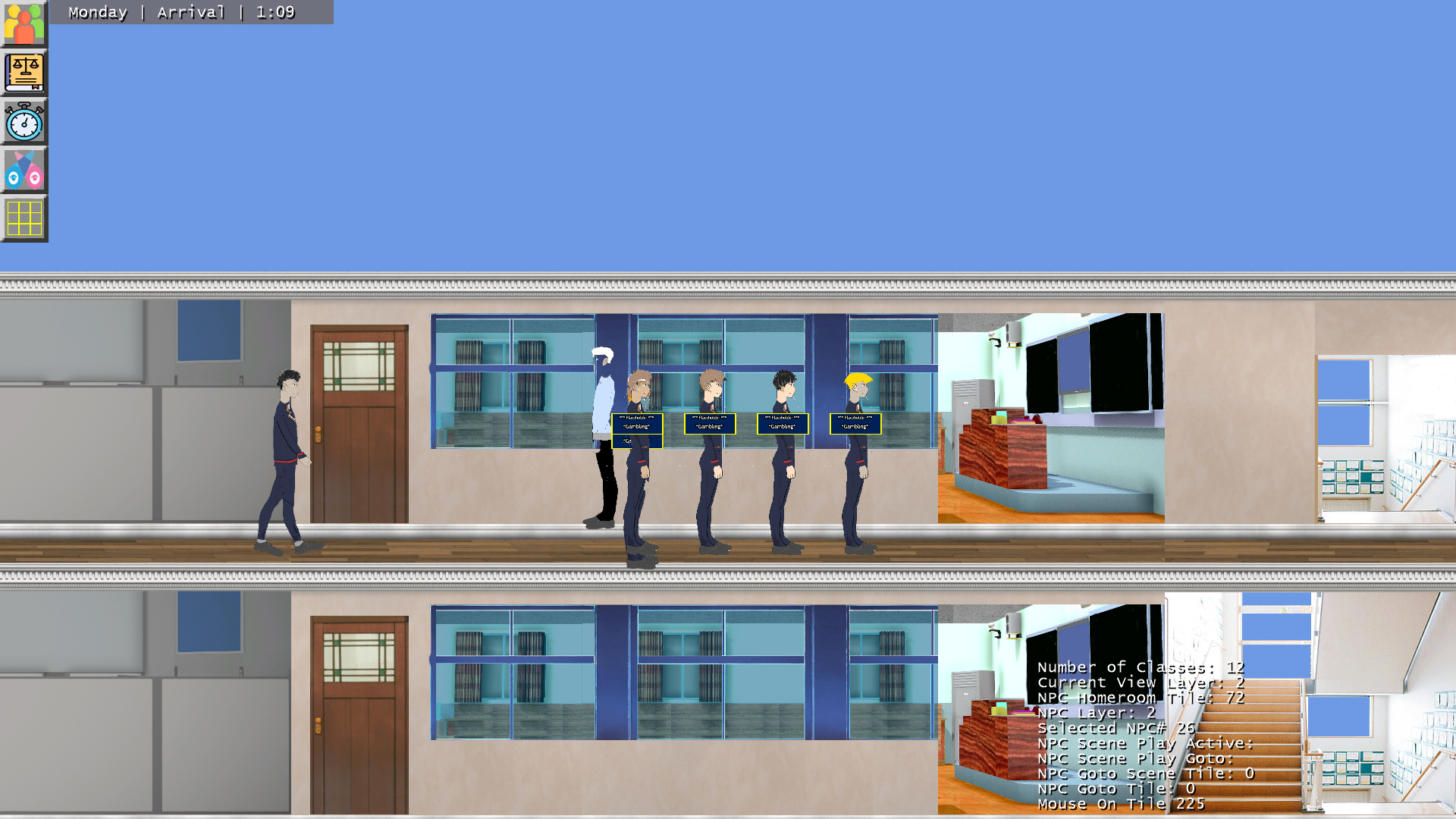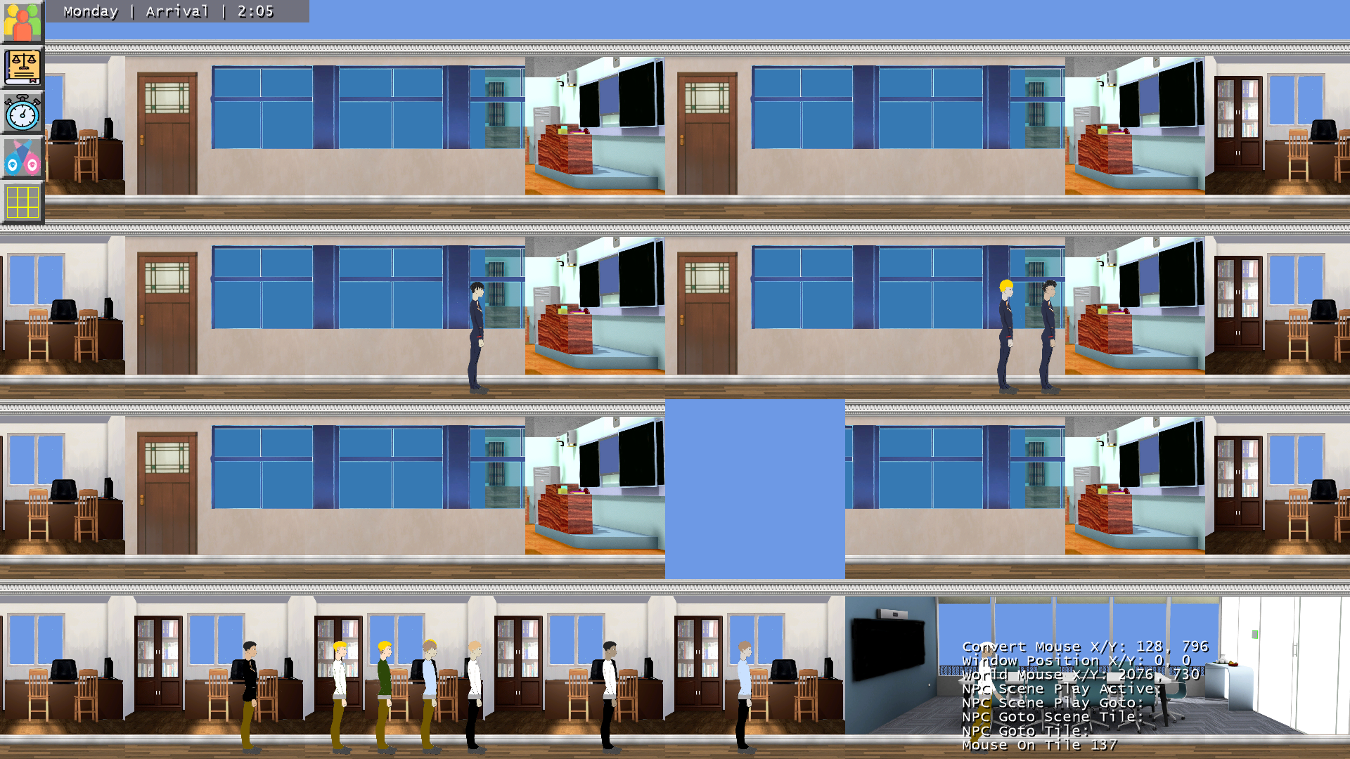 The A.I. has some issues in that it would not attempt to do other activities and also freeze up at the door for many. It is mostly fixed in the upcoming #4 build, but we're still working on narrowing down where a major performance bottleneck seems to be after many students spawn before release.